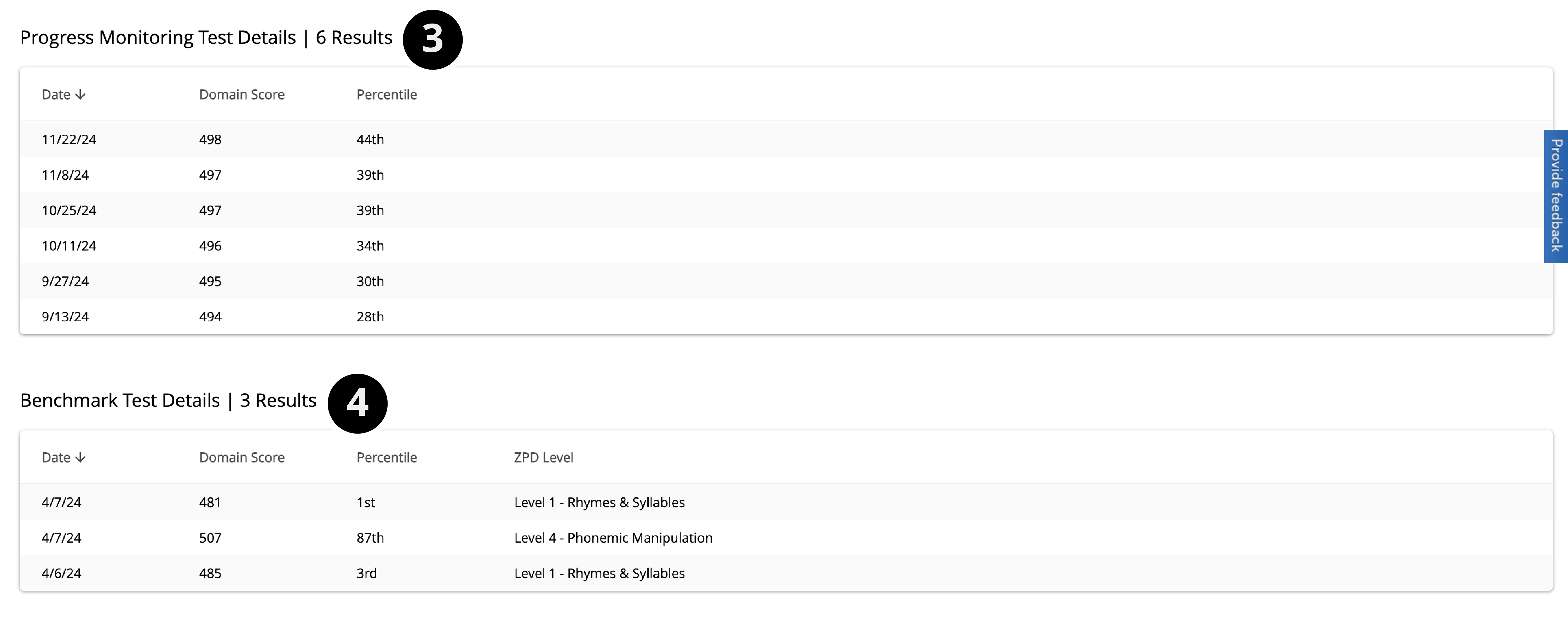 • Zones of proximal development (ZPDs) in Phonological Awareness and Phonics & Word Recognition skills progressions (refer to Interpretive Tables to learn how these are determined)