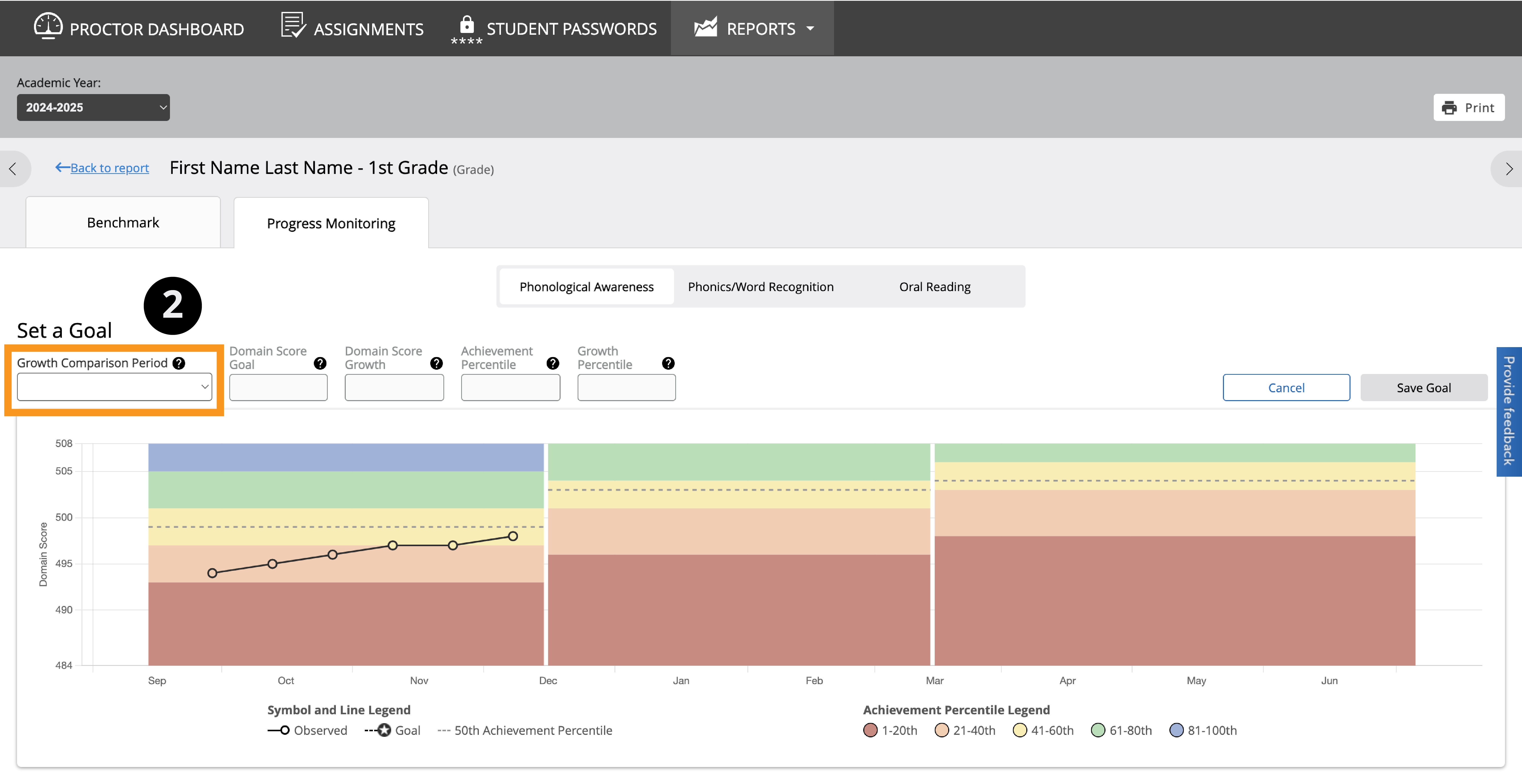 Note: The growth comparison period list is populated based on which terms have reportable Progress Monitoring data. If the start term has multiple data points, the goal will be based on the first domain score in the growth comparison period (the starting domain score).