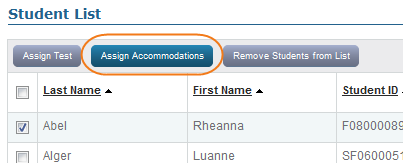 If needed, you can change an assigned accommodation any time before a student starts testing. However, once the student starts testing, you cannot change the chosen accommodation, except by using Suspend, choosing Test Again, and then making the change. After you make the change, the student would sign in again.